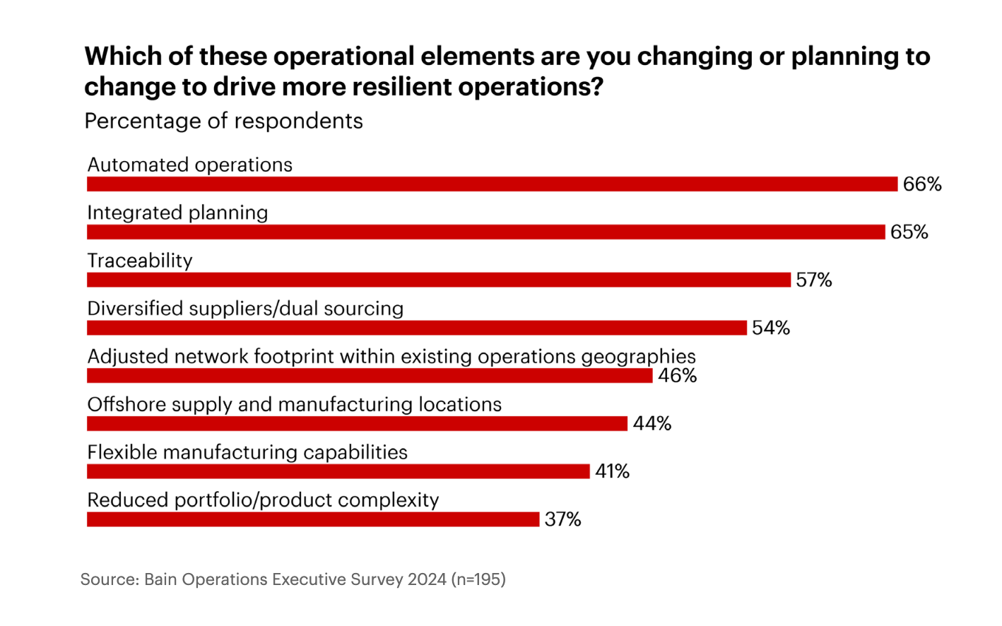 These reasons and more are why CEOs today are increasingly leaning on tactics such as automation, supplier diversification or flexible manufacturing capabilities to develop deeper resilience, according to Bain & Company's research: