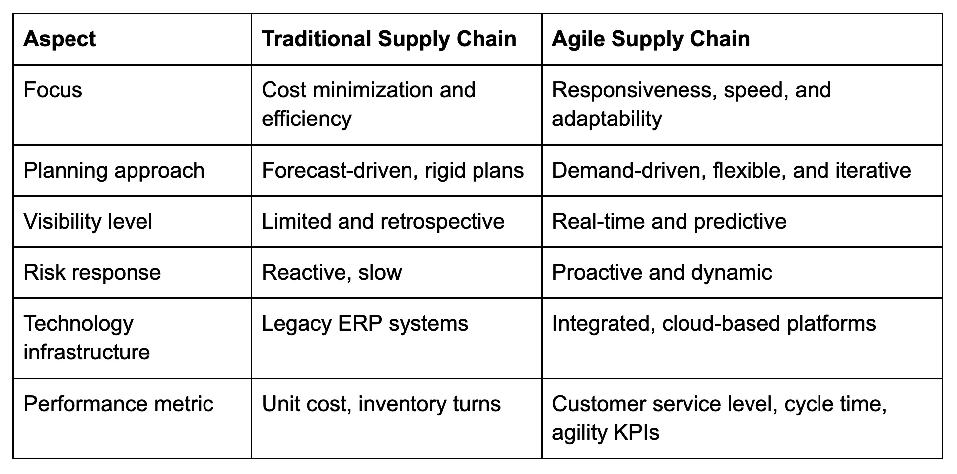 - Compared with traditional models, agile supply chains prioritize flexibility over cost optimization alone