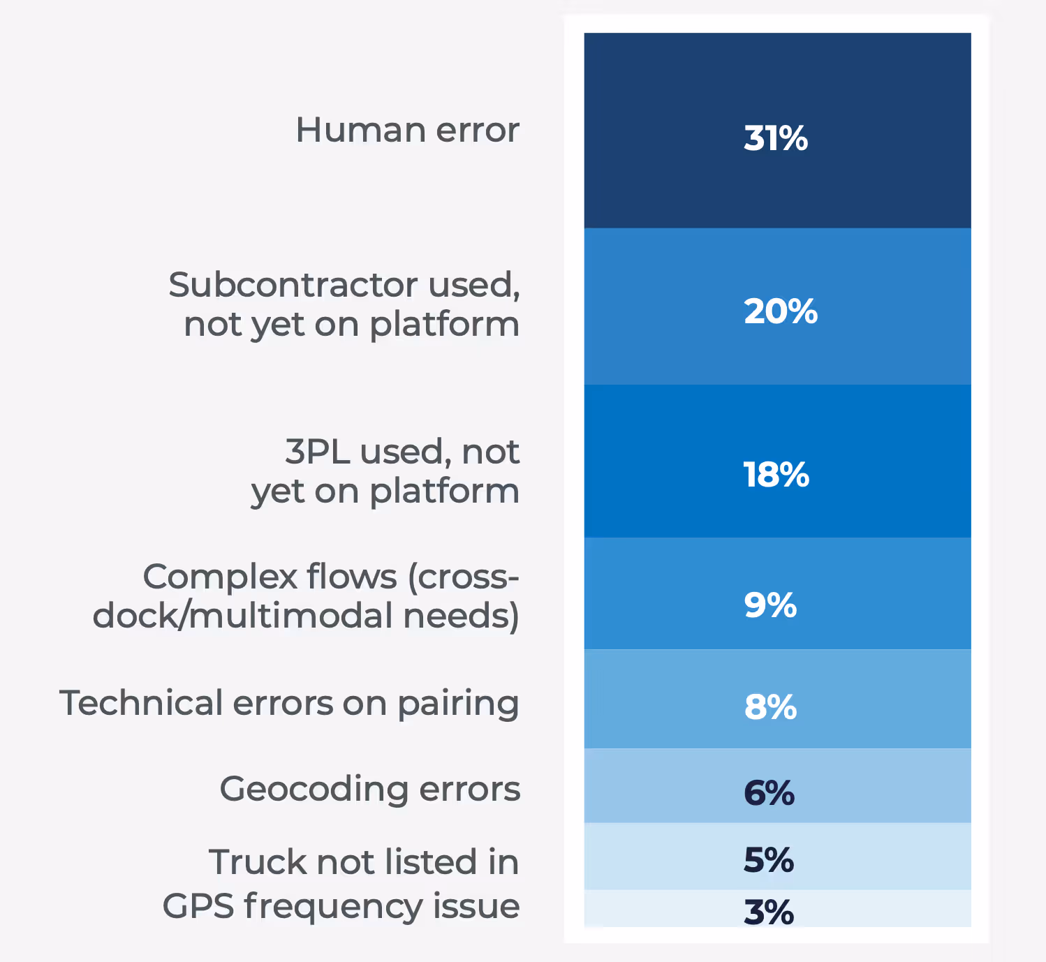 For example, some of the common causes of low tracking rates once a RTTV project goes live (see the top three reasons in the illustration below) suggest inadequate onboarding is to blame. Quality-focused carrier onboarding reduces low tracking rates. With appropriate training and change management, around 70% of no-tracking events could be avoided.