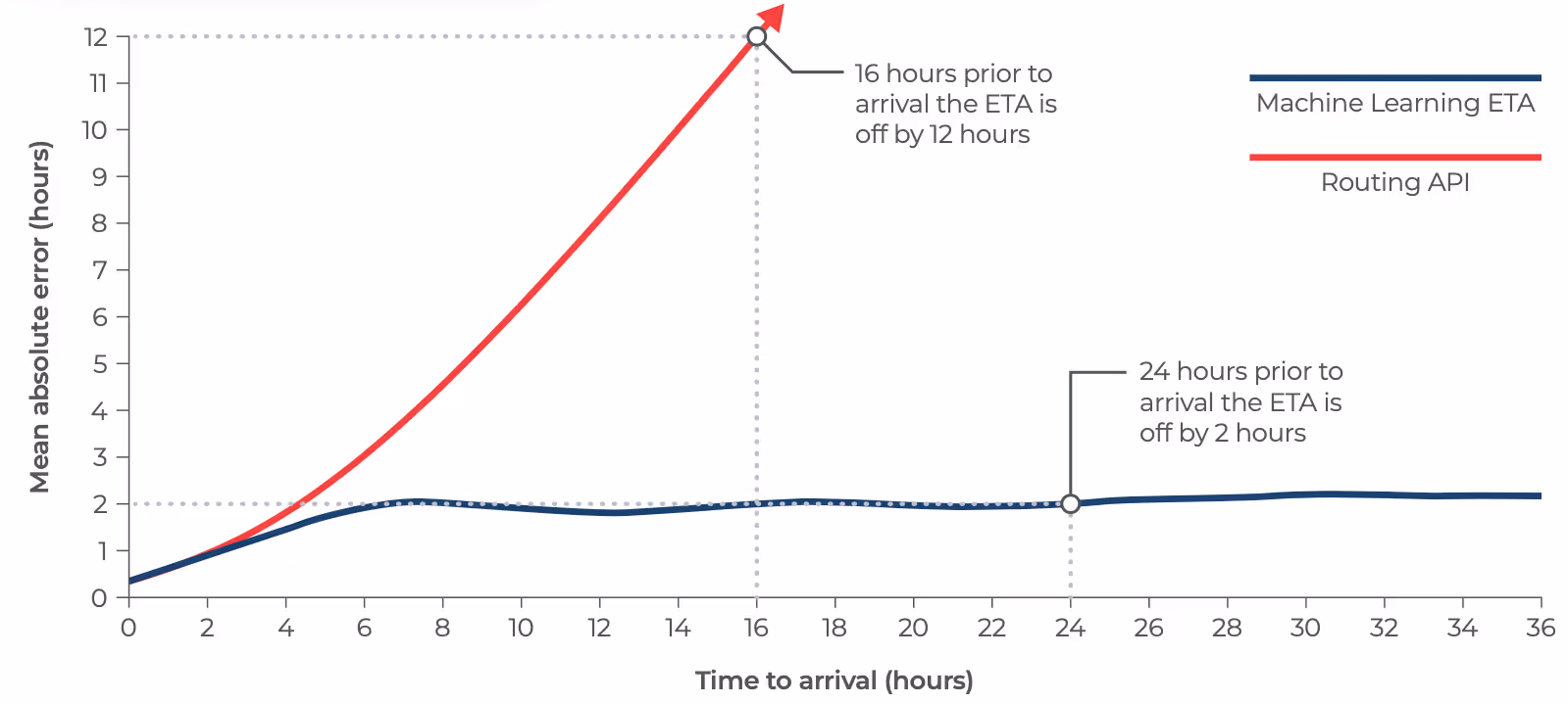 An ETA calculation aided by machine learning on the other hand achieves a mean absolute error of around 2 hours, even when calculated 24 hours ahead of a planned delivery.