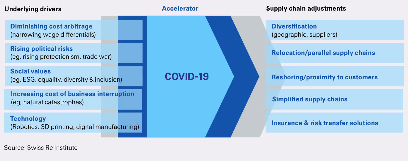 The impact of Covid-related measures in 2020 seems to be accelerating the existing trends of de-globalization, automation and sustainability as well as reversing trends of the past several decades such as international mobility and urbanization. The pandemic has left economies around the world in recession and many believe the full effects on the global economy has not yet been fully realized, meaning tougher times are still to come.
